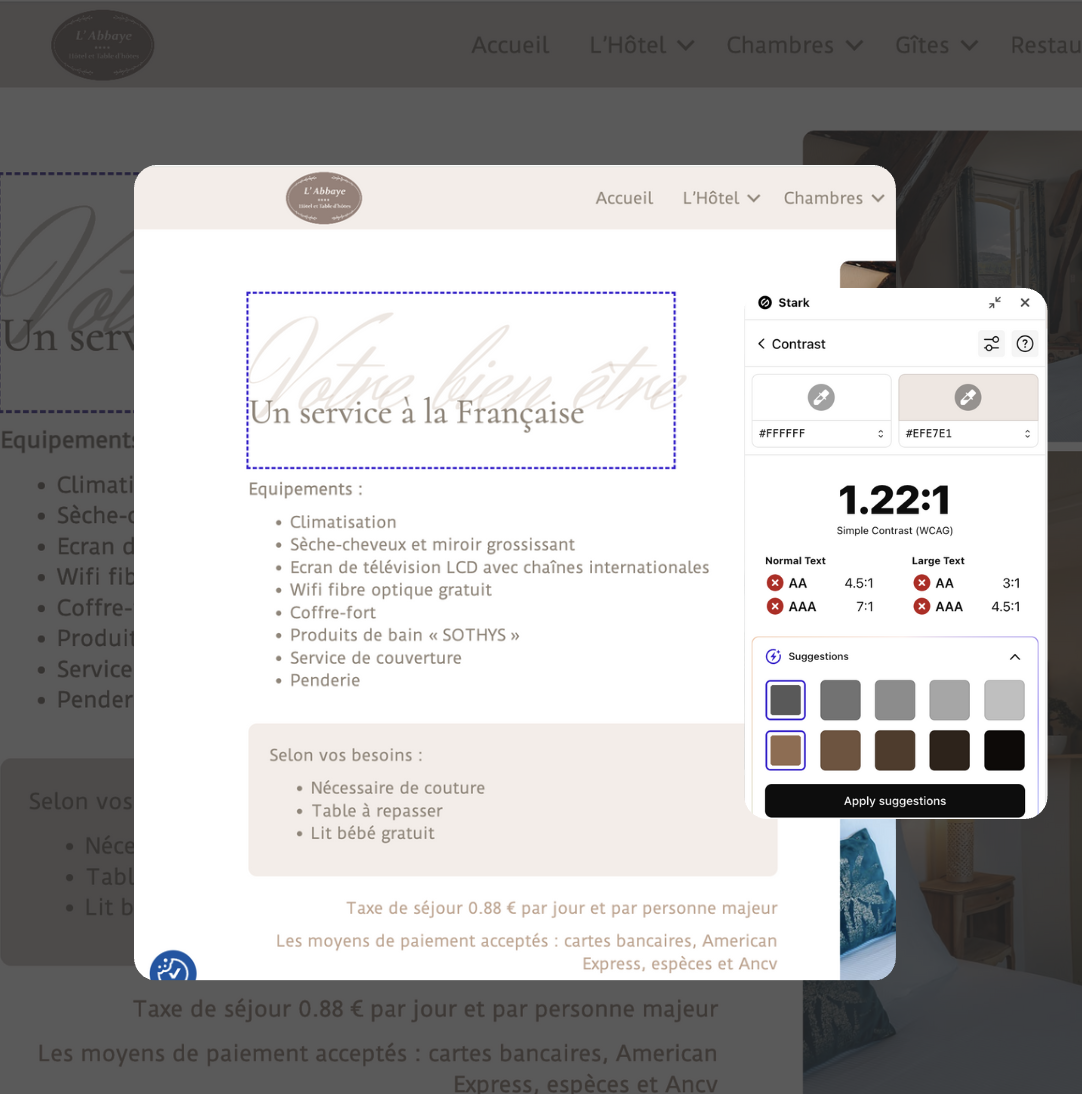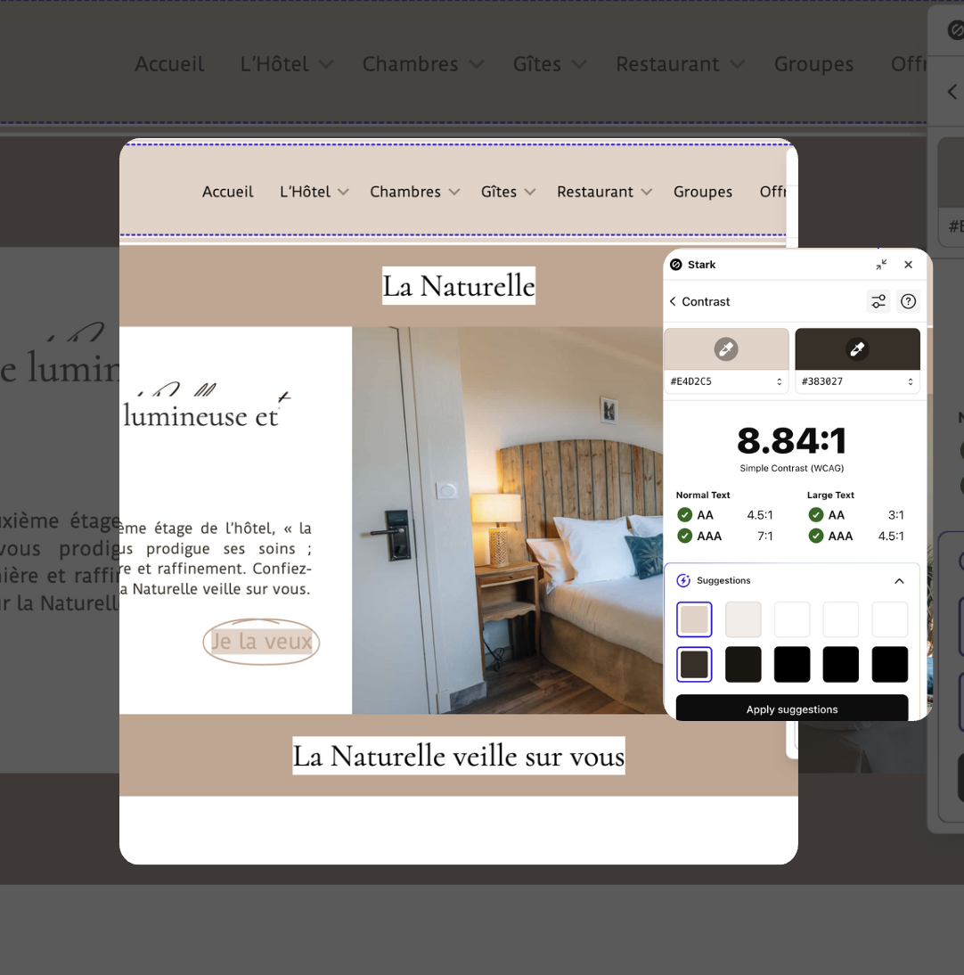 Recommandations : Utiliser la couleur #383027 sur un fond #E4D2C5 est plus adapté pour respecter les normes WCAG.