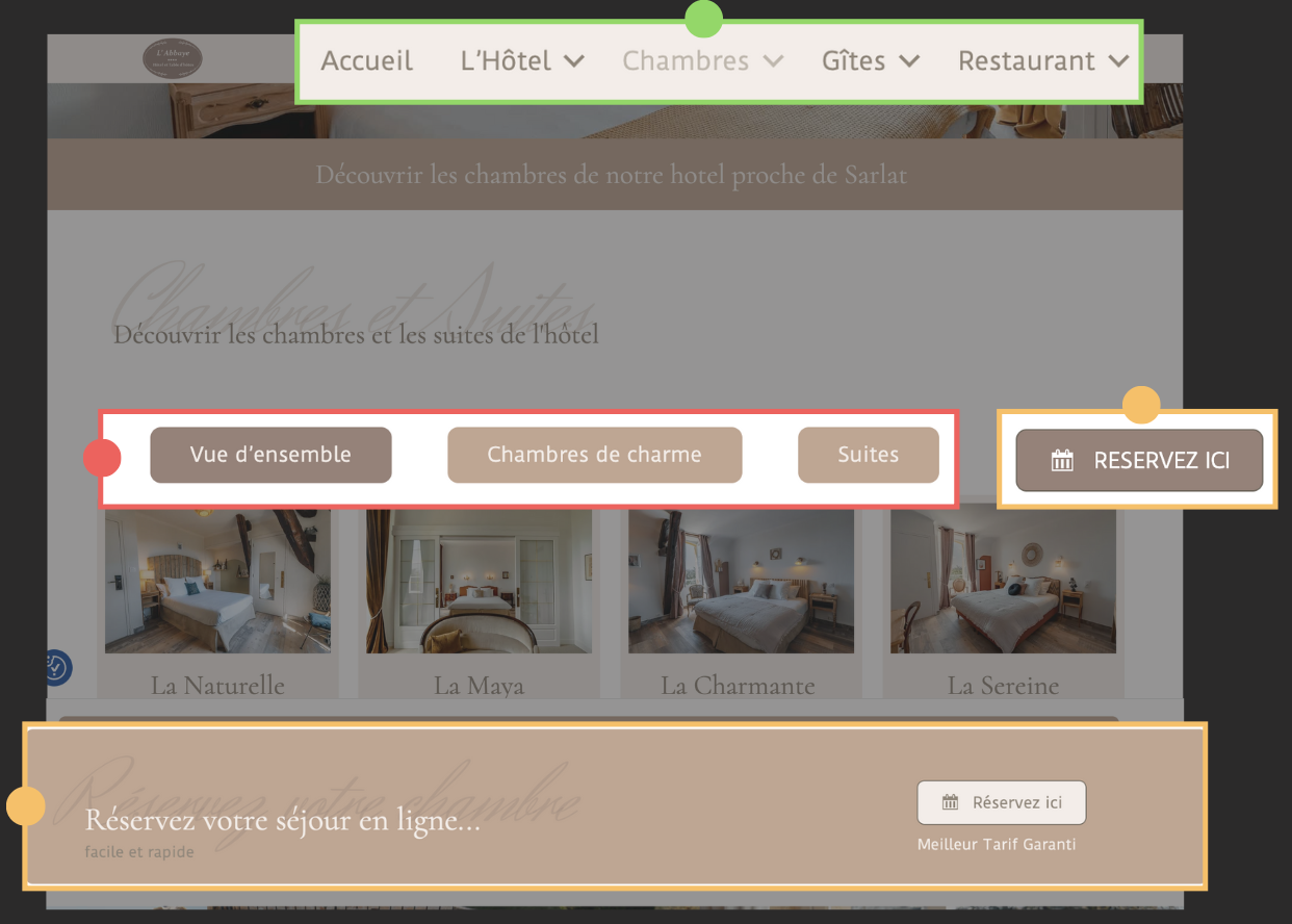 L'architecture de l'information du menu manque de clarté et de structuration, la réservation d'une chambre n'est pas mise en avant.
